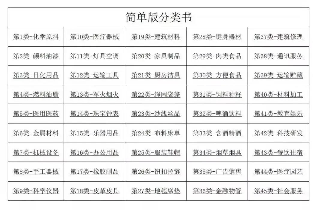 商标类别指的是所要注册的商标所属的行业,我国采用尼斯商品分类,商标注册用商品和服务分类表共分为45类,指向特定的产品与服务,其中1-34是商品类别,35-45是服务类别。商标分类后可便于检索、管理、审查。